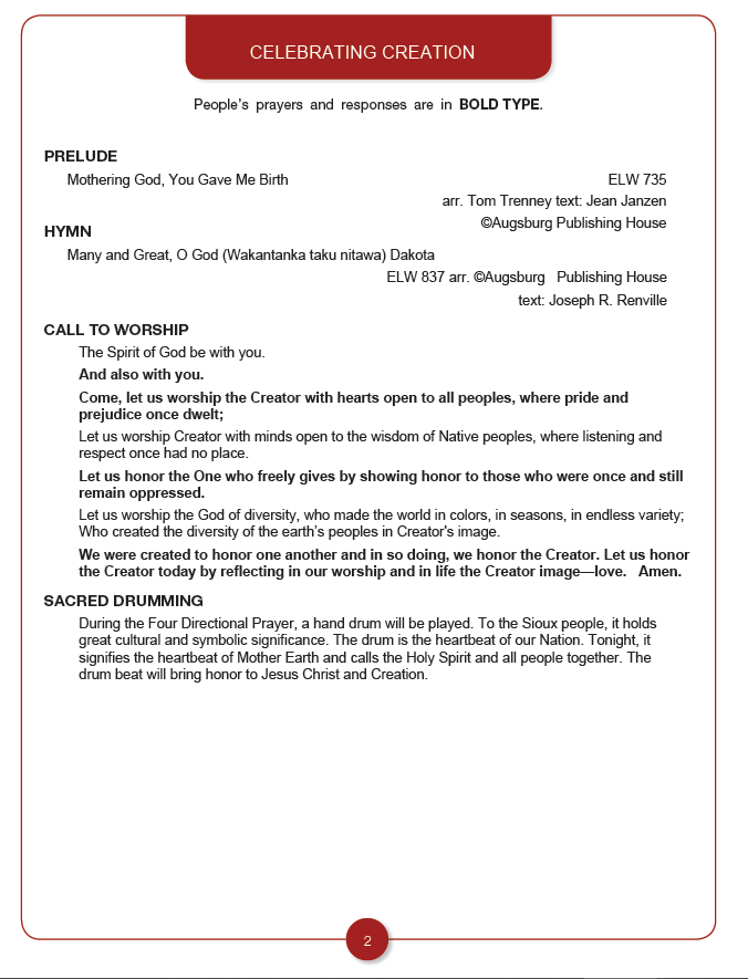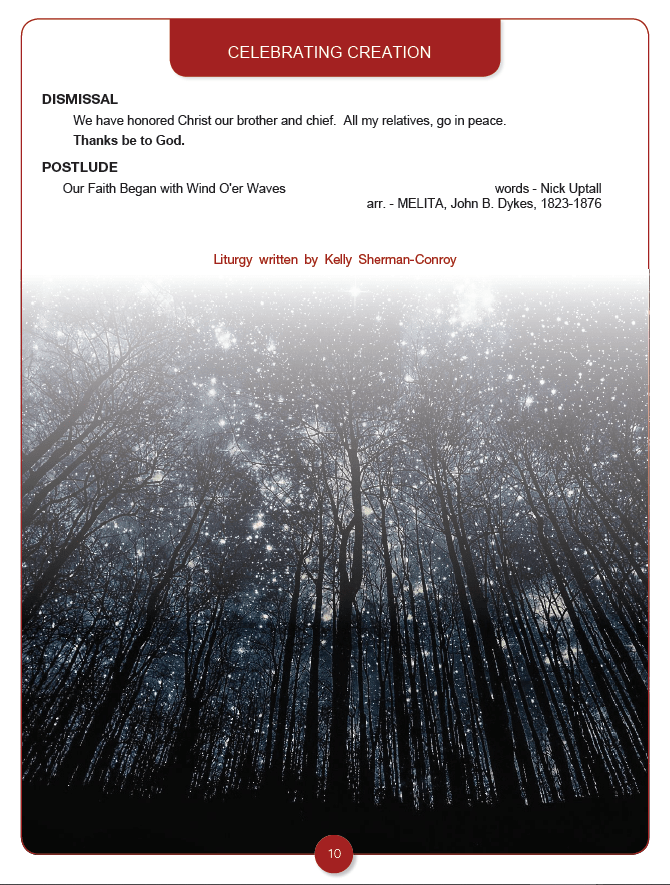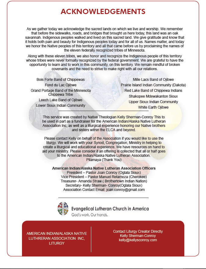 This Liturgy was created by me as an example of what worship is through a Native Theological lens. I was blessed to work with many of my Native elders and mentors who guided this process so that it would be a respectful and celebratory experience for all participating. Honoring both my Christian and Native traditions and spirituality. Please contact me if you would like to learn more, or be guided in using this service in a respectful way as it was intended.